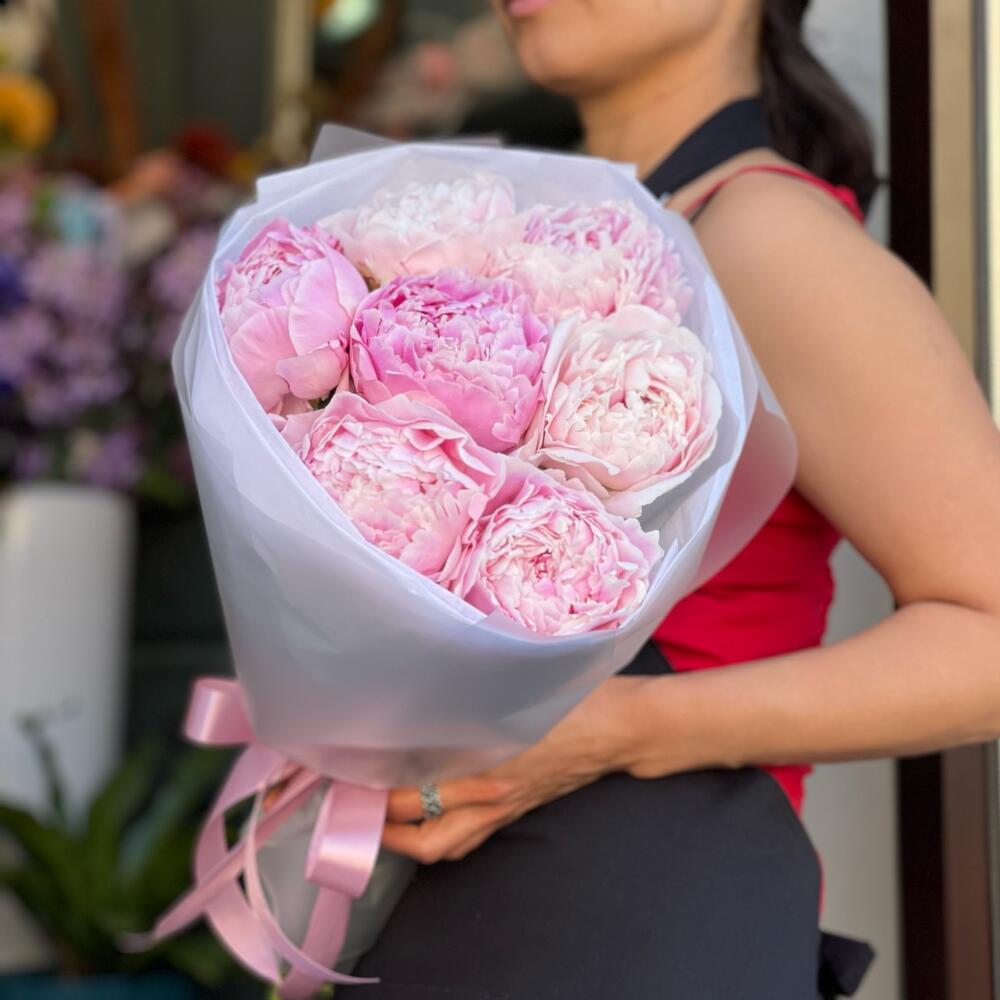 Лента – 1 шт.Пион – 7 шт.Упаковка дизайнерская – 1 шт.