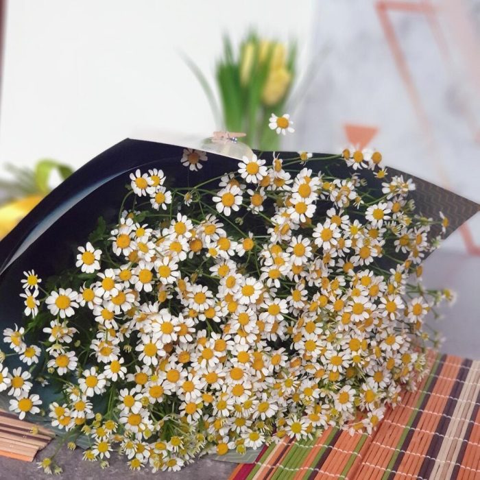 Лента атласная – 2 шт.Ромашка кустовая – 15 шт.Крафт упаковка – 2 шт.Открыточка с вашими пожеланиями – 1 шт.