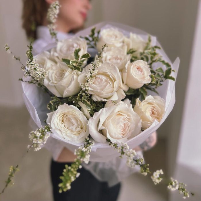 Зелень – 7 шт.Пионовидная роза – 11 шт.Упаковка дизайнерская – 1 шт.