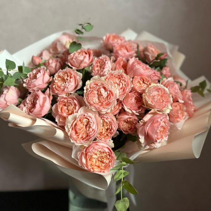 Букет из моно пионовидной кустовой розы Джульетта и эвкалипт