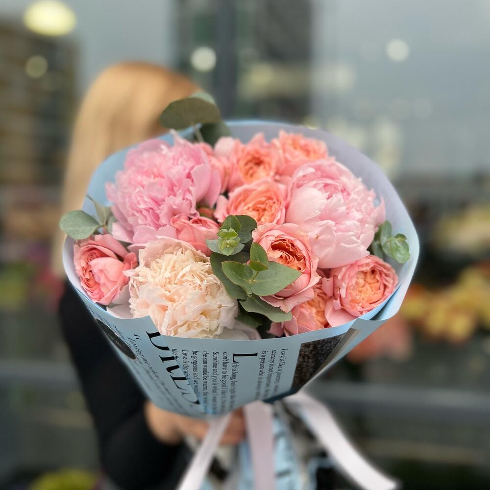 Эвкалипт – 5 шт.Атласная лента – 1 шт.Кустовая пионовидная роза – 2 шт.декоративная упаковка – 1 шт.пионы – 3 шт.