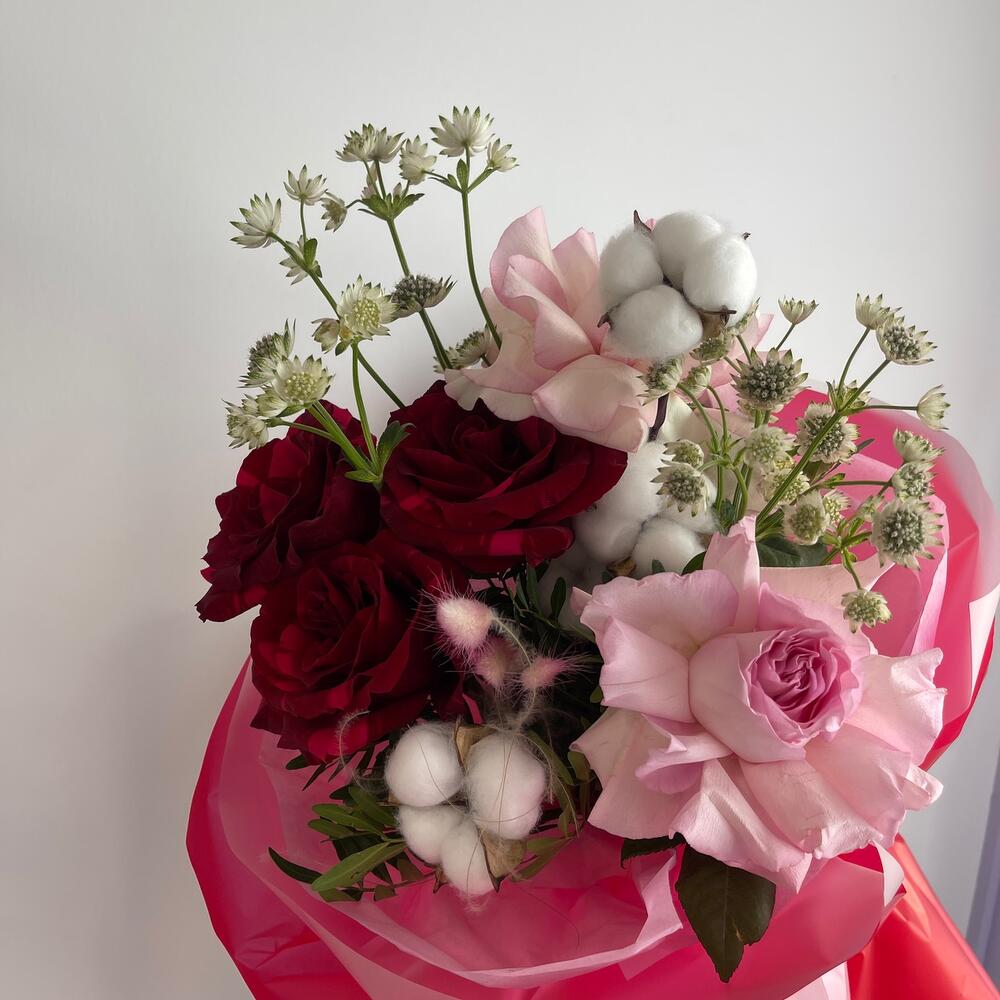 Хлопок – 4 шт.Лента атласная – 2 шт.Фисташка – 1 шт.Французская роза – 2 шт.Пленка матовая – 6 шт.астронция – 2 шт.