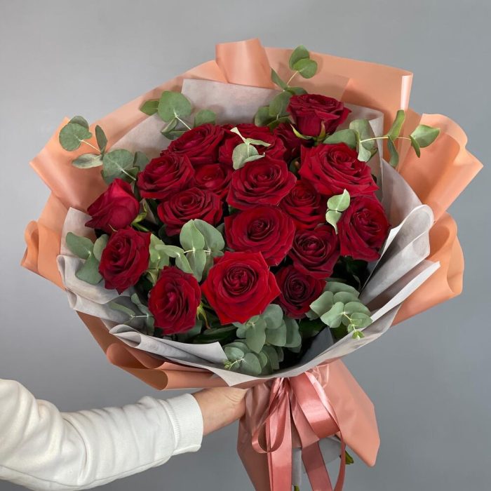 Лента – 2 шт.Эвкалипт – 2 шт.Упаковка – 2 шт.Роза наоми – 19 шт.