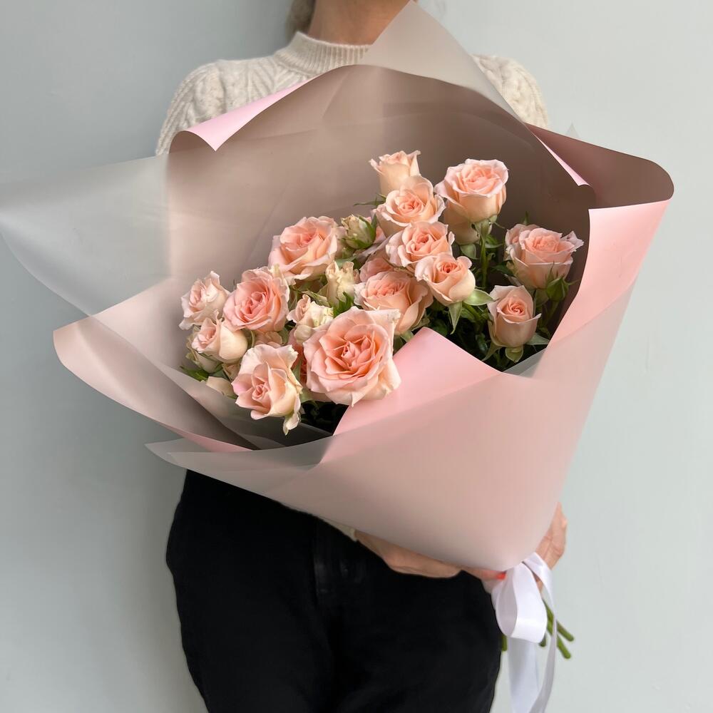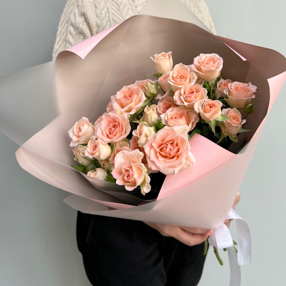 Кустовая роза – 5 шт.Лента атласная – 1 шт.Упаковка дизайнерская – 3 шт.