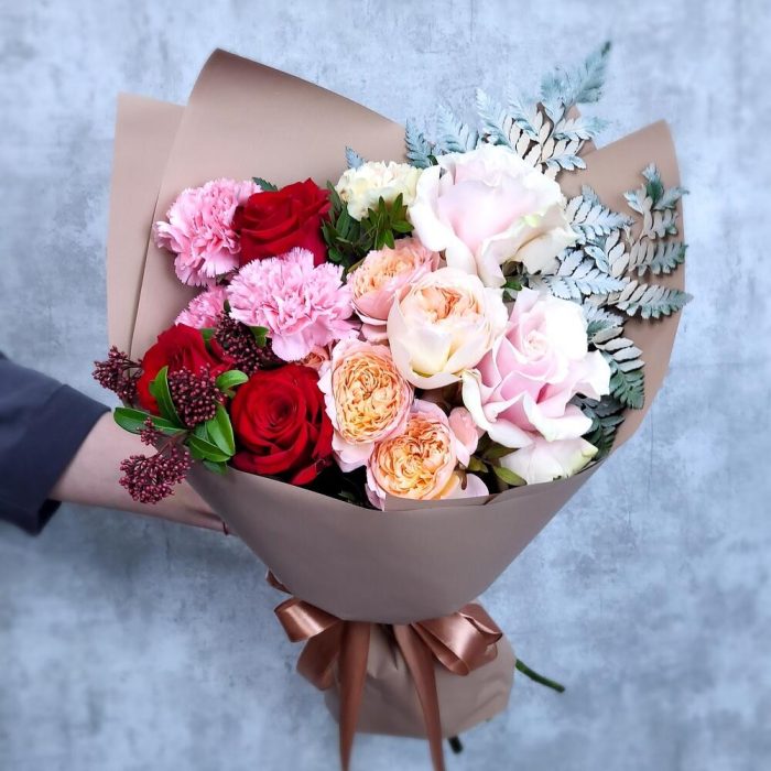 Роза Эквадор – 2 шт.Роза Россия – 3 шт.Роза пионовидная – 1 шт.Скиммия – 1 шт.Упаковка дизайнерская – 1 шт.Роза Джульетта – 1 шт.